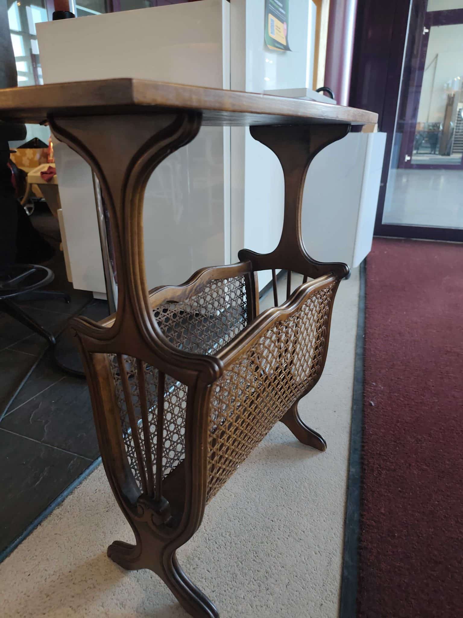 Un petit meuble porte-revues en bois pratique et authentique, idéal pour organiser vos magazines et apporter une touche chaleureuse à votre intérieur.
